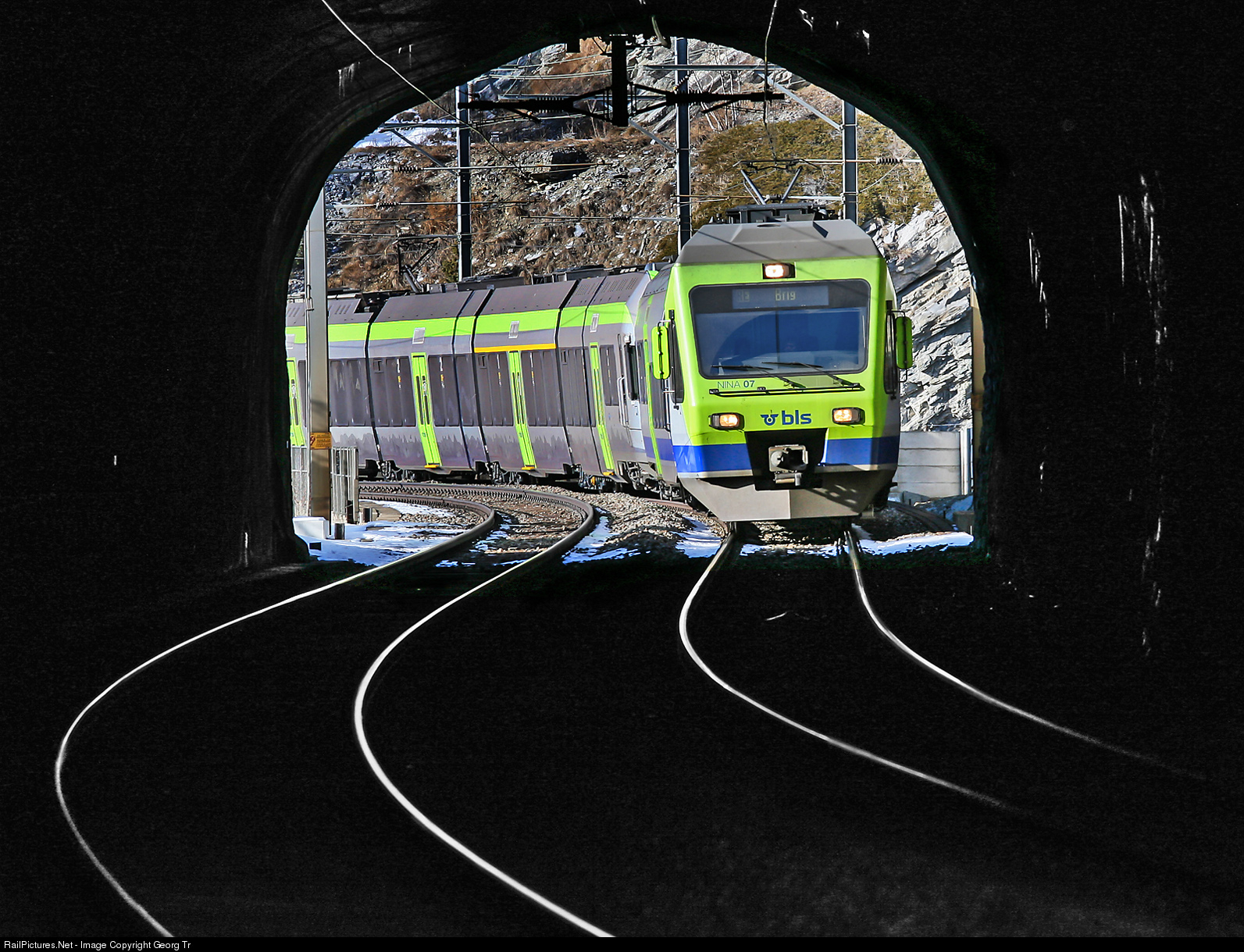 | "NINA" (Niederflur Nahverkehrszug/lowfloor regional train) RABe 525 # 007 and a LOETSCHBERGER RABe 535 trainset of the BLS are running the RegioExpress RE 3267 from Spiez via Frutigen-Kandersteg-Goppenstein to Brig, just entering the 107 m long Schluchi tunnel near Hohtenn. |