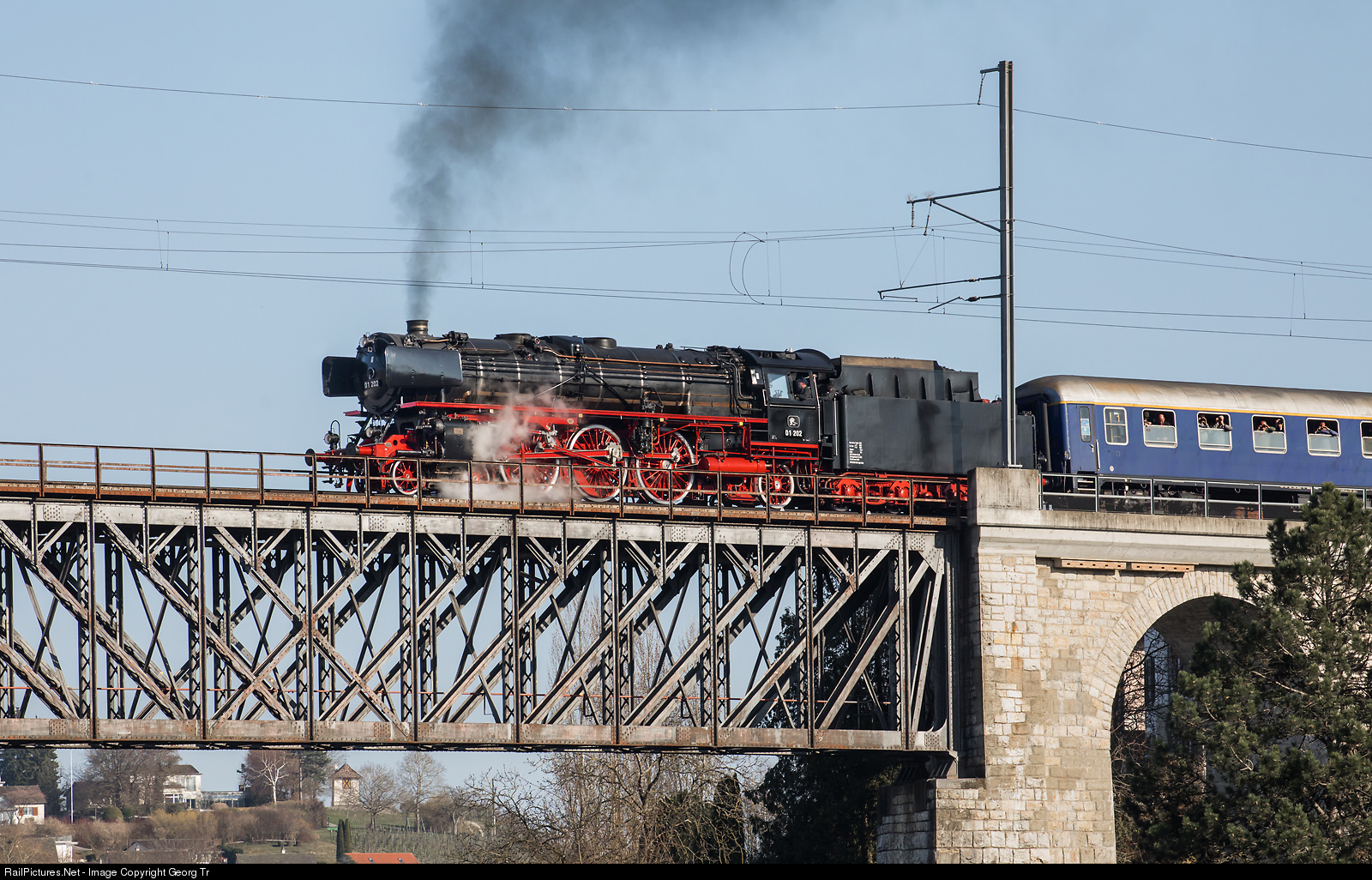 | The former Deutsche Bundesbahn 4-6-2 express train steamlocomotive 01 # 202 of the association "Pacific 01 202" from Lyss, is crossing the Rhine river between Feuerthalen and Schaffhausen on the 262 meter long bridge which was built in 1895. The 112 metre long, riveted, welded-iron truss has parallel belts and a height of 6 metres. The cars are former Deutsche Bundesbahn first class cars and a Bar car (former BD) of the IGE Eisenbahn- und Erlebnisreisen Gmbh, Hersbruck/Germany. |