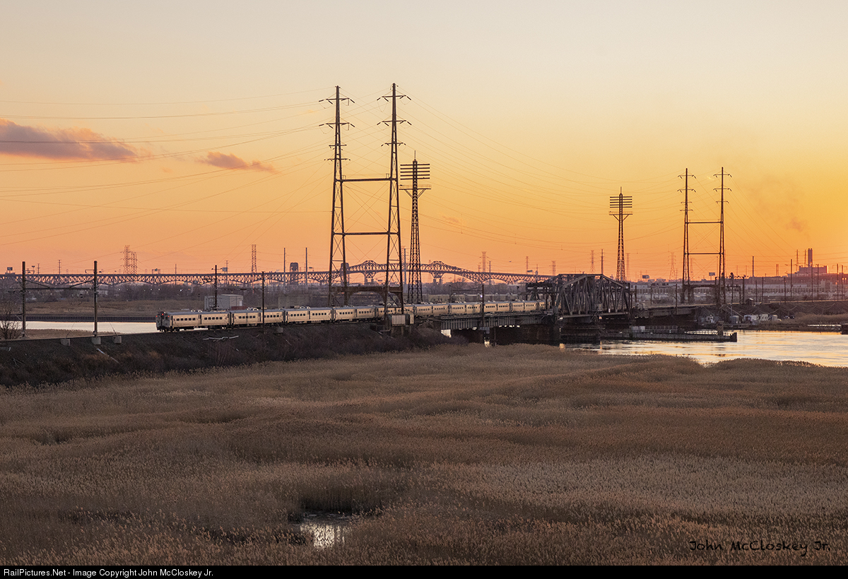 A Trenton bound Arrow set is seen racing west thru the Meadowlands across PORTAL as the sun sets over Northern New Jersey.