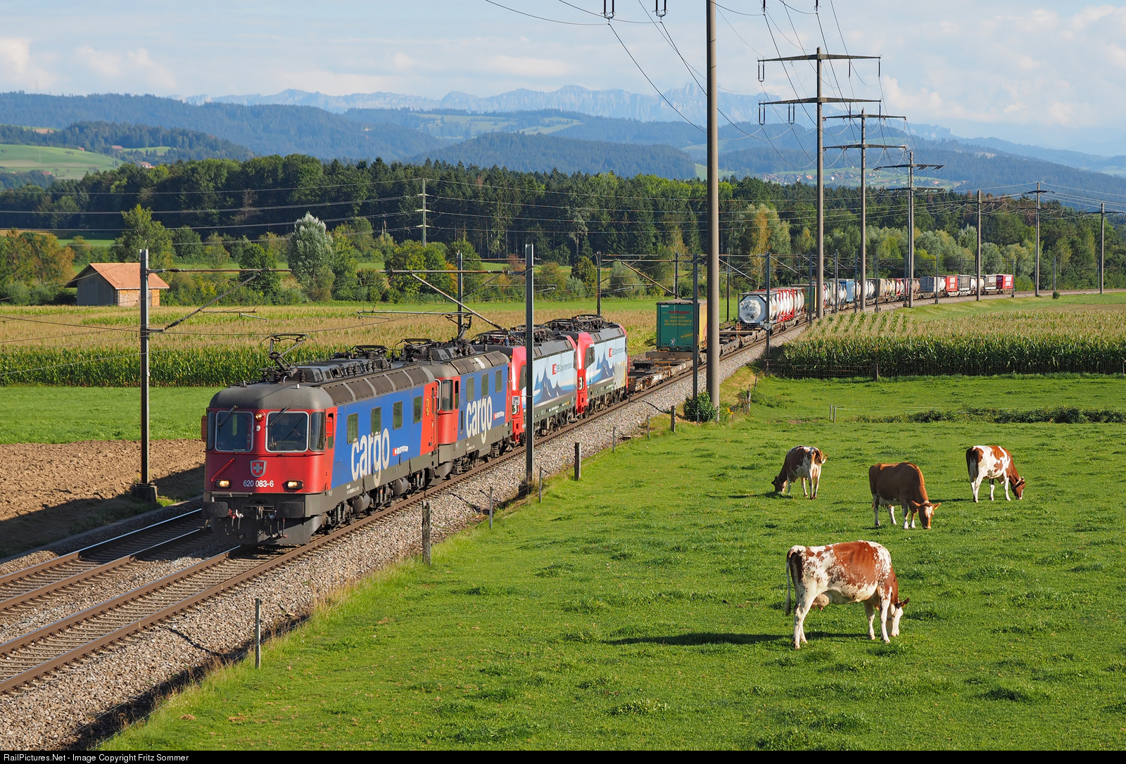 | For SBB Cargo's Re 10/10 team, it is an easy task to pull two younger family members and some container wagons northwards. Photo taken 17 September 2019; Allmendingen in the Aare Valley.
