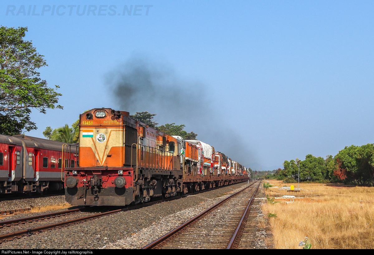 Lightly smoking ALCo was grinding the tracks with heavy load of loaded trucks as it pass my train, VERAVAL Express at Ankola