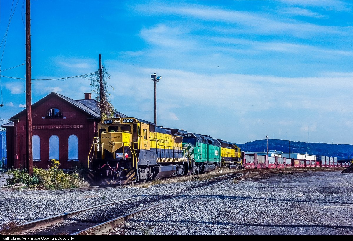Waiting for a crew, westbound Susquehanna Sea-Land stack train NTV-9 lays over in Binghamton, New York. Today’s power is a Susquehanna B40-8, a Motive Power Leasing F45, and an NYS&W SD45.