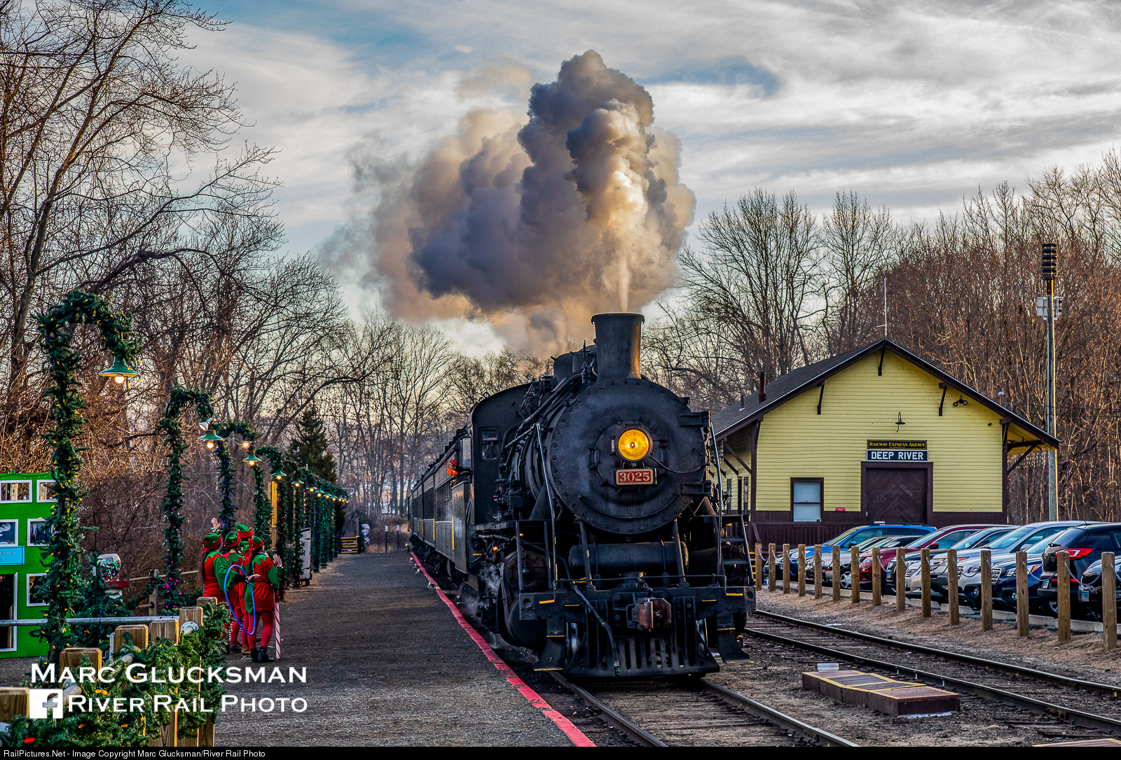 | The Valley Railroad's 3025 arrives at the "North Pole" at the Deep River Station on the afternoon of December 22, 2019 as the Santa's team awaits on the platform. The Chinese built 2-8-2 was an almost complete reconstruction by the Valley after extensive fire damage in 2008 while still at the Knox & Kane Railroad property, and was returned to service in 2011. |