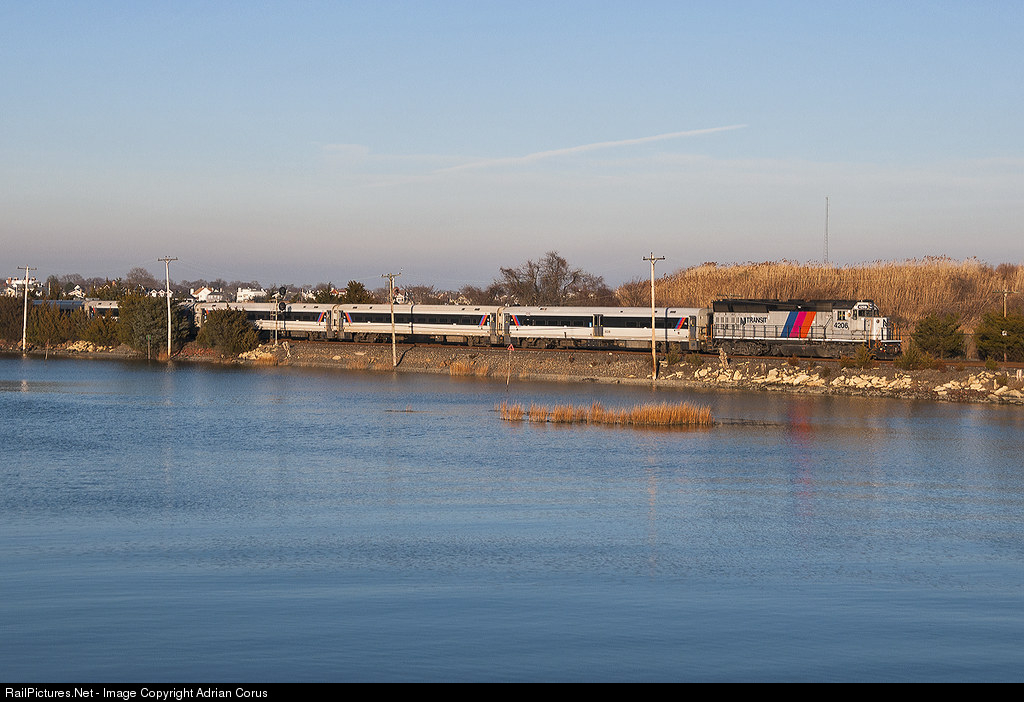 | NJT train 4745 makes its way past the waters of the Manasquan with GP40PH-2B 4206 on point. The train will soon make a station stop at Point Pleasant Beach before terminating in Bay Head. It will then round the Bay Head loop and begin it’s next run to Long Branch. |