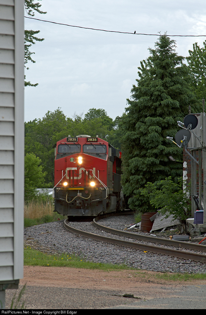 | CN 2835 and its crew got underway at Junction City, WI, diverging from the mainline on a tight curve between residences and a tavern. Not much clearance for those satellite dishes. |
