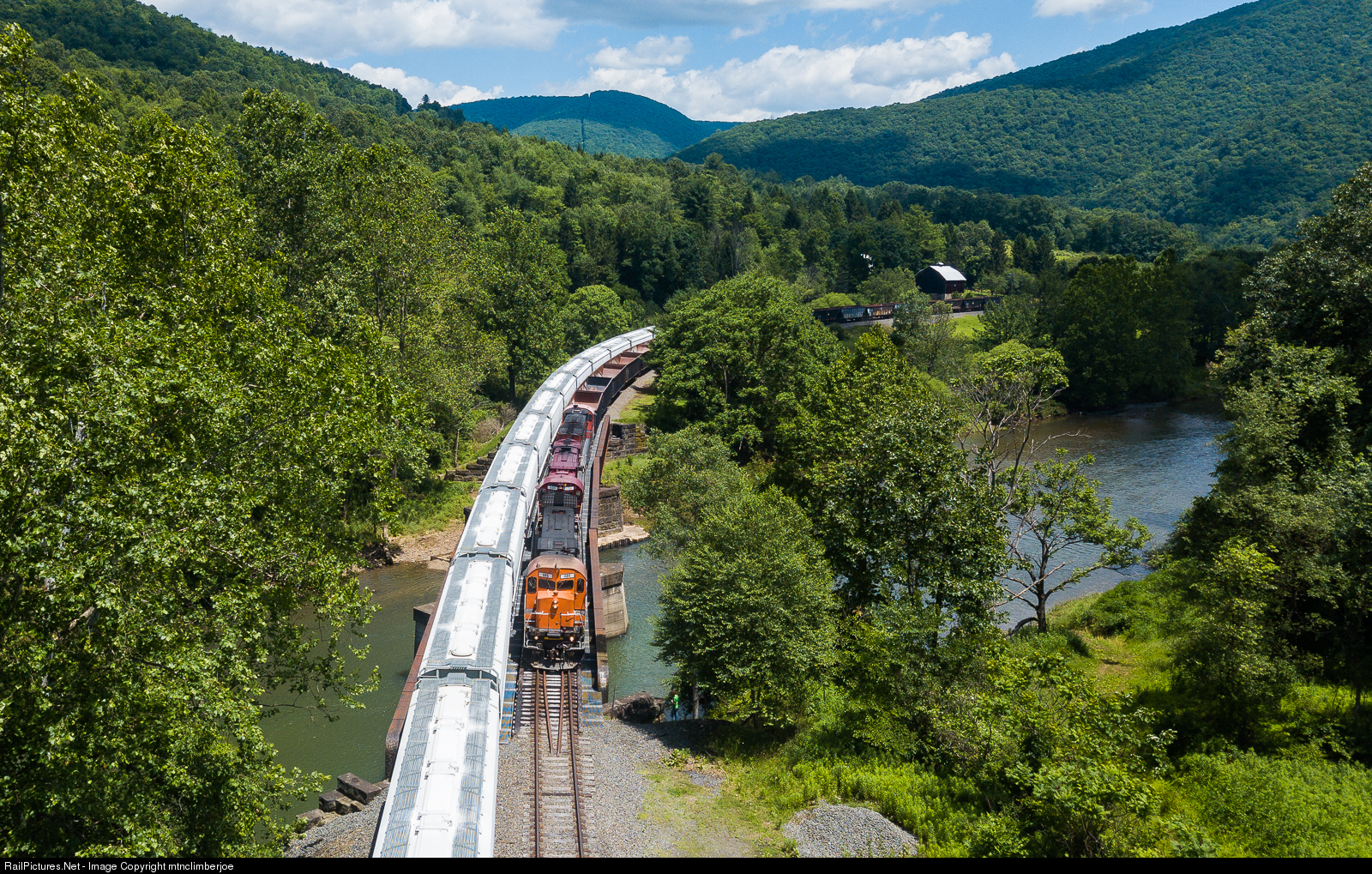 | The WNYP's Driftwood turn makes their way across Sinnemahoning Creek on the NS Buffalo Line. The trio of MLW's lead a train of empty stone hoppers south, passing a long string of covered hoppers awaiting pickup by the Buffalo & Pittsburgh. |