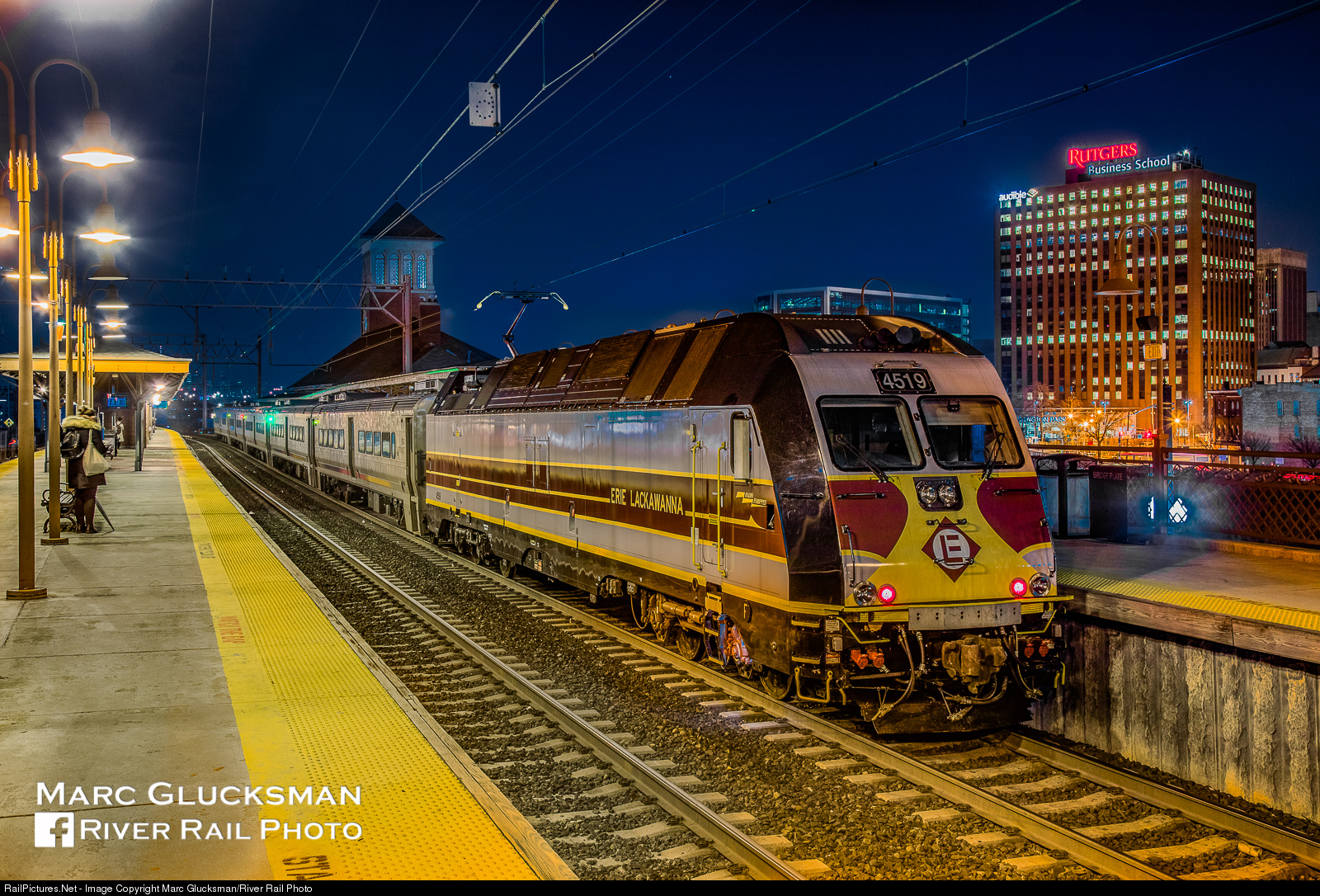| The change from overhead electric to diesel mode at Newark's Broad Street station offered an opportunity to photograph NJTR 4519 (ALP45DP) on the first day of revenue operation of this unit since the "EL" wrap was applied on NJ TRANSIT Train 858 on its "EL home rails". The Rutgers Business School is one of the corporate intitatives to restore commerical activity in downtown Newark. |
