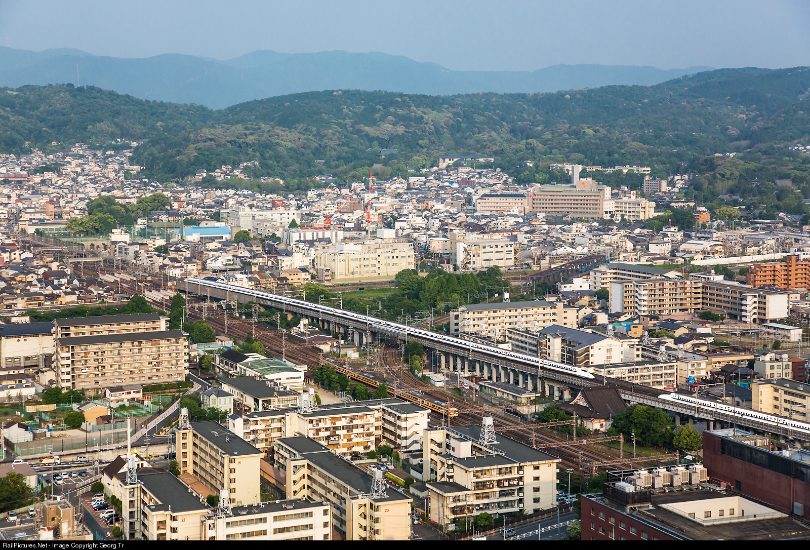 | Meeting of two N700 shinkansen trains of JR Central east of Kyoto station. In the foreground the cape gauge tracks with a regional train. Kyoto station is just on the right. The view is from the Kyoto tower, about 100 meter above ground. |