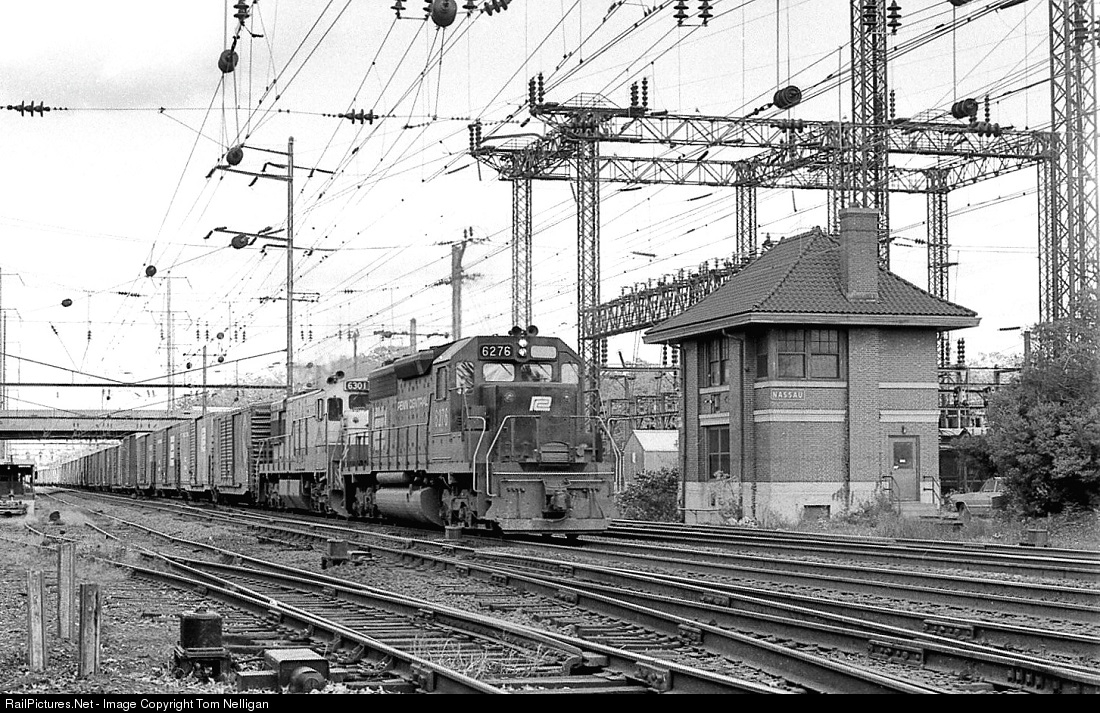 | A former Penn Central SD40 and a Reading U30C team up on a Conrail freight approaching Nassau Tower in Princeton Jct., NJ, on a bleak October day. |
