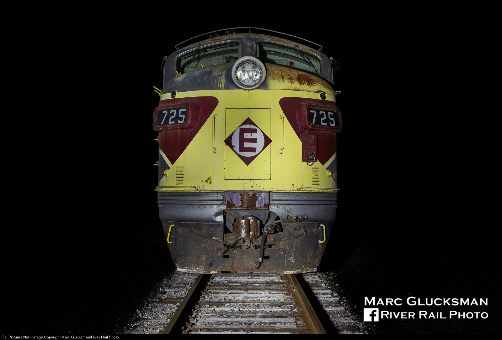 | When former B&LE F7 725 (dressed as a semi-Erie Lackawanna unit from its most recent owner) was delivered to the Stourbridge Line by NYSW SU 100 on the night of March 24, 2019, it was parked at the interchange, allowing for this photo after the engine had been secured. It has since been moved to Stourbridge Line's Honesdale shops and is currently under restoration. |
