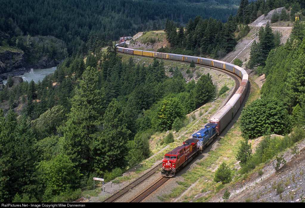 Snaking through serpentine trackage in British Columbia’s Fraser River Canyon is a westbound Canadian Pacific freight train at Conrad on July 8, 2004. A pair of GE AC4400CWs power the train—CP No. 8635 and blue CEFX No. 1004.