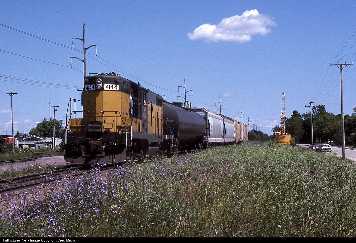 CNW 4144 is ready to depart Sheboygan, WI with a Plymouth Turn in July of 1985. The train will back down to the Sheboygan River and then head west to Kohler, Sheboygan Falls, and Plymouth. The reefers on the rear of the train are destined for Borden's Cheese in Plymouth. Operations on this line would soon be cut back to Sheboygan Falls, and then to Kohler, only to be reopened again a few years ago by the WSOR/WAMX.