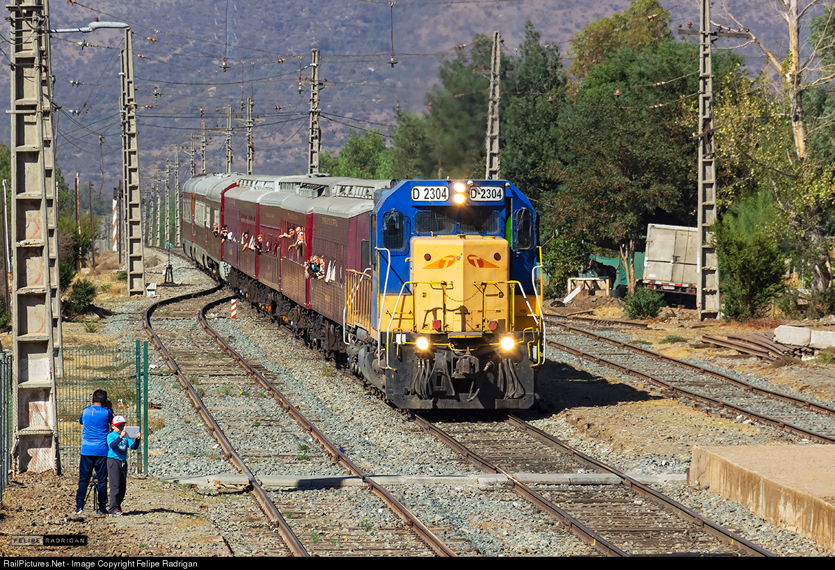 | Led by Transap's D-2304, the "Expreso del Recuerdo" heritage train slowly enters Til Til station by the main track and stops in order to wait for the authorization to move on. |