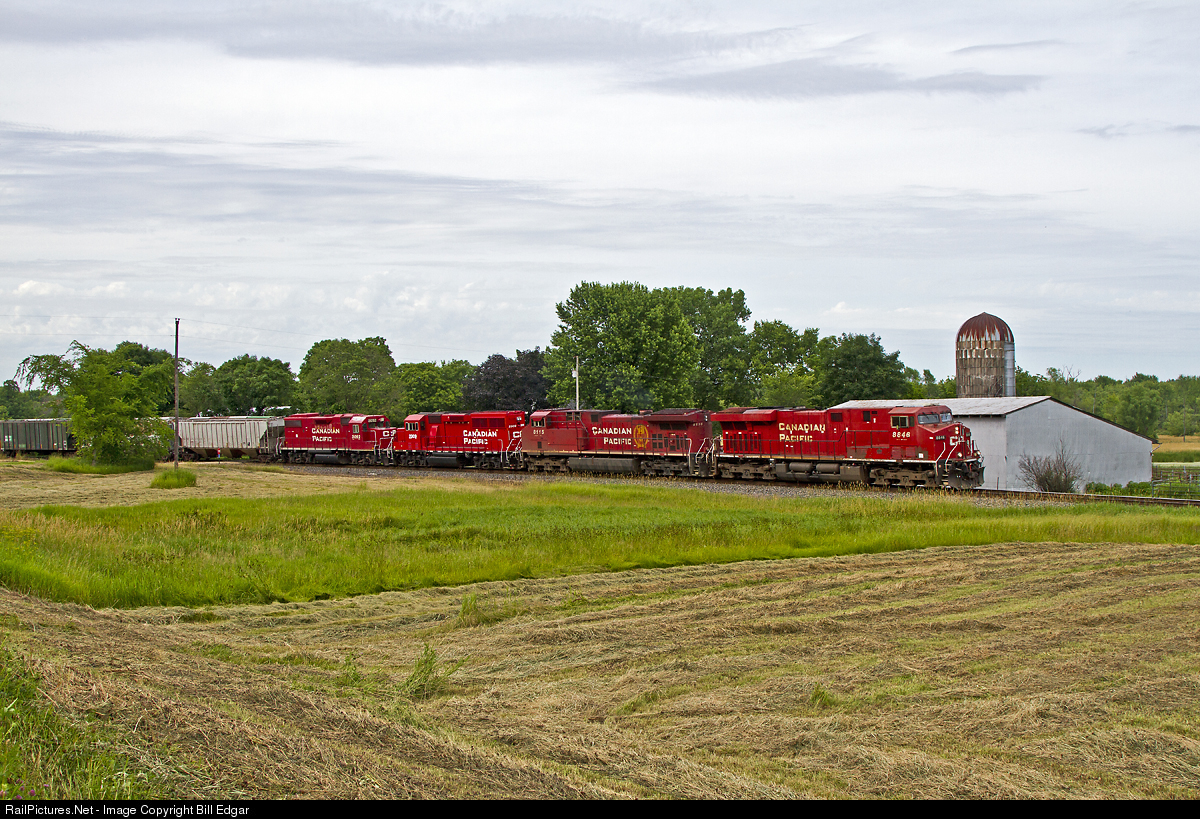 A CP grain train with an interesting array of power strolls past a farm a few miles south of La Crescent, MN as it heads south on CP's former MILW line along the Mississippi River to Kansas City. The rear two units are most likely being transferred to a local assignment.