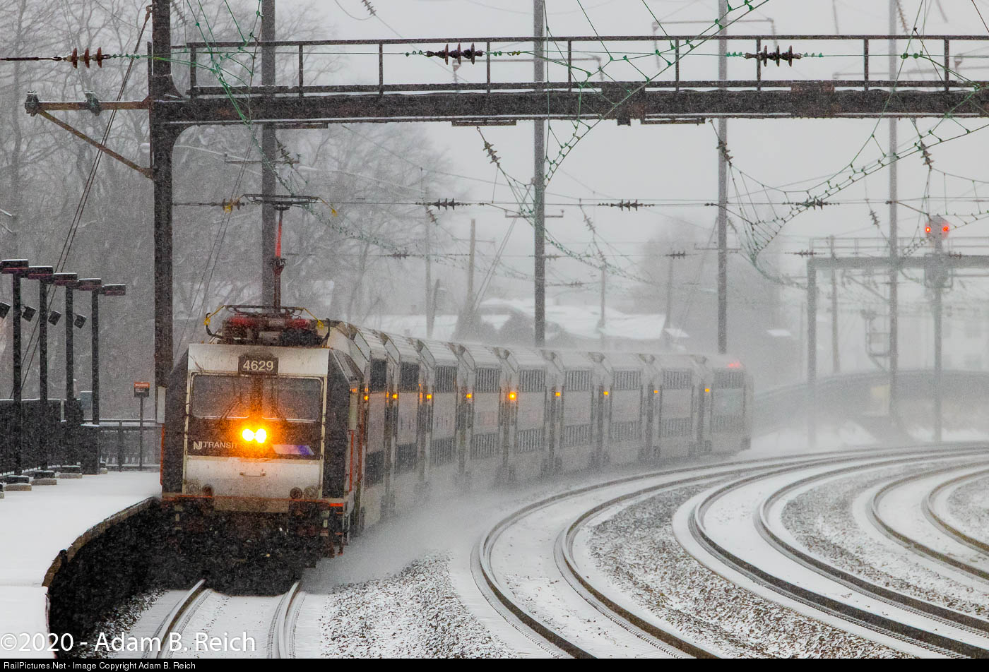 ALP-46A #4629 leads Trenton-bound Northeast Corridor Line Train #7857 into Metropark during the first snowstorm of the decade in Central Jersey.