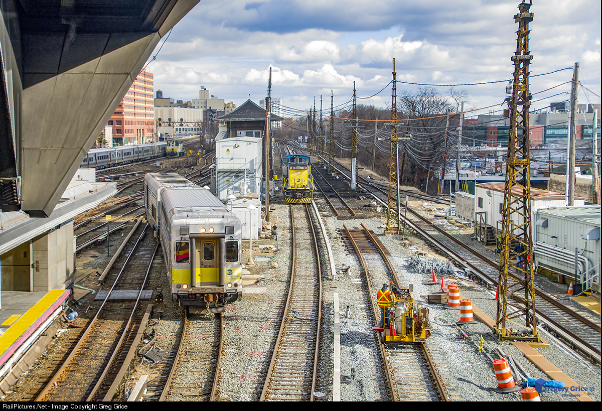 A weekend Roustabout passes by Hall Tower while MP15AC #165 sits on standby on Track 9 as a "mobile air plant" for Hall Interlocking in Jamaica. The switches within Hall Interlocking are still air-powered and require a locomotive's air supply during extremely low temperatures. |