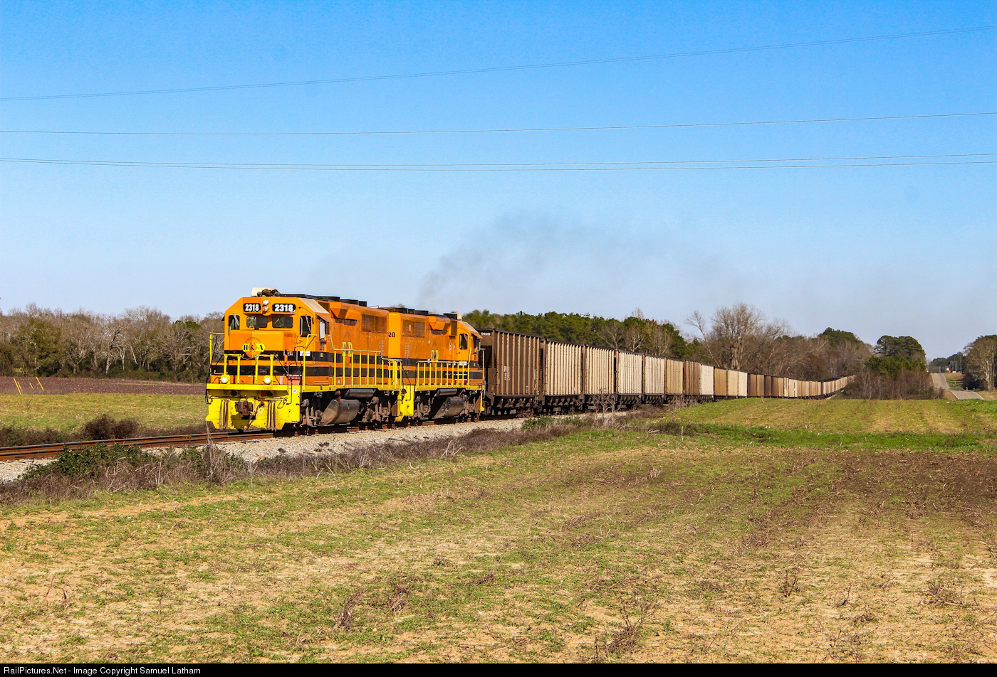 | With the EMD prime movers screaming in run 8, Hilton and Albany Railroad GP39-2 2318 leads a sister GP39-2 lettered for the Bay Line and 135 empty coal cars up a series of hogbacks in rural southwest Georgia. I came across this movement on a whim. These cars are destined for storage for the winter. |