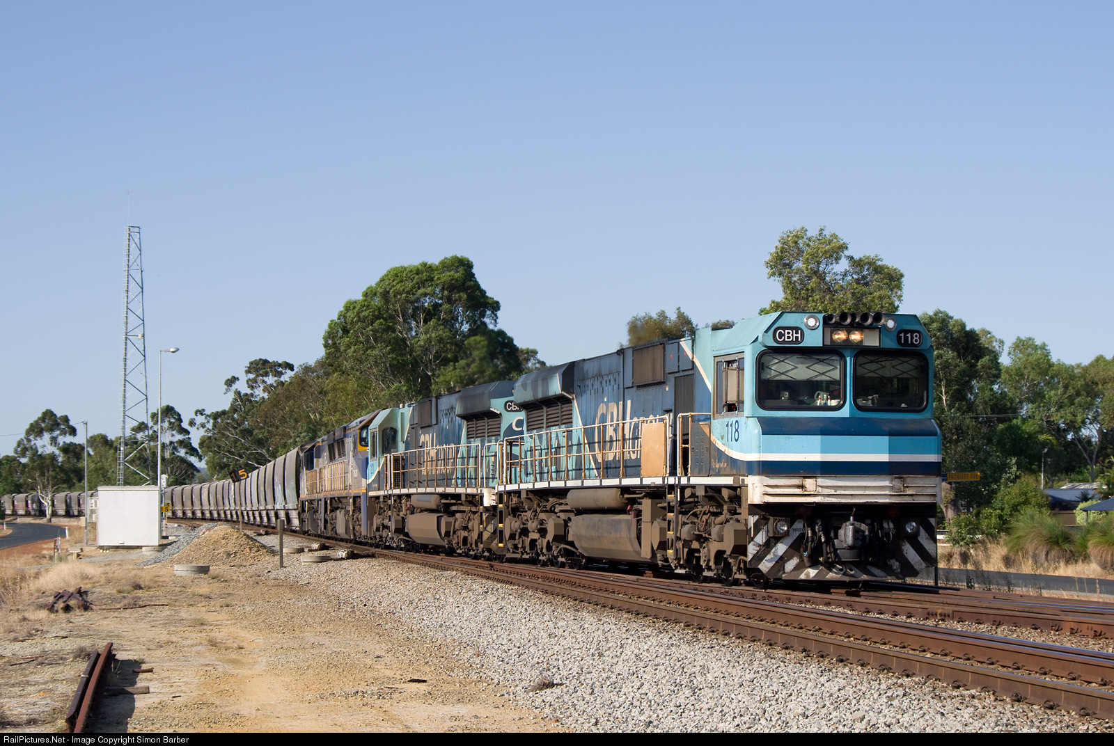 | CBH118, 121, VL357 and 361 cross over from the down to the up mains at Millendon Junction with a loaded grain train. |