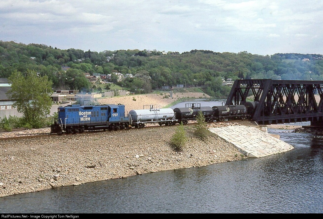 | In the early 1980s, Boston & Maine train WA-1 provided freight service on Metro North's Waterbury branch between Waterbury and Derby, CT. GP9 1707 was in charge this day as WA-1 headed north across the Naugatuck River at Ansonia. |