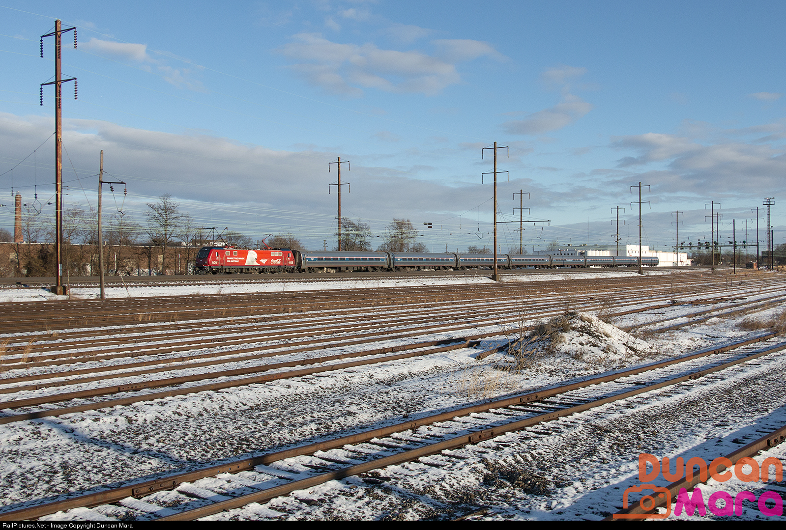 Amtrak's Coca Cola Holiday wrapped ACS-64 leads Northeast Regional train 153 past Stiles Street Yard in Linden after a light dusting of snow from the night before.