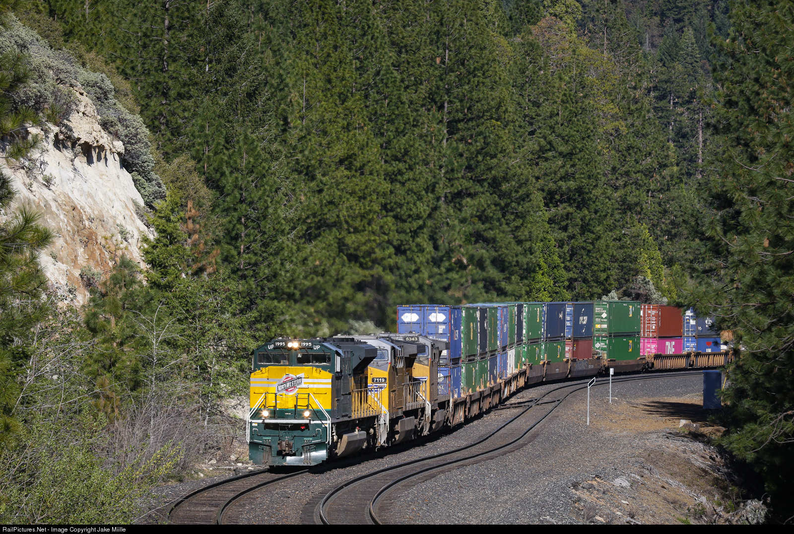 | Winding through the forests of the Sierra Nevada Mountains, Union Pacific 1995 leads a westbound Z train through the small community of Alta, California. This train is approaching the steepest section of the Donner Pass Route where grades top out at 2.4%. Due to the heavy braking required, the smell of brakes quickly replaced the fresh mountain air. |