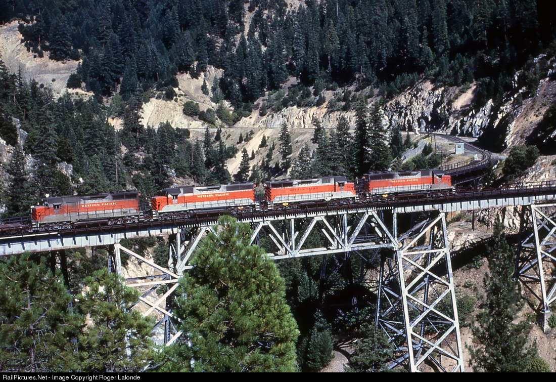 Four Western Pacific GP units, GP40 3510, GP35 3019, GP40 3516 and GP35 3005 lead a freight over the Keddie Wye heading east towards Reno, Nevada. Photo from my slide collection, the photographer was not specified.