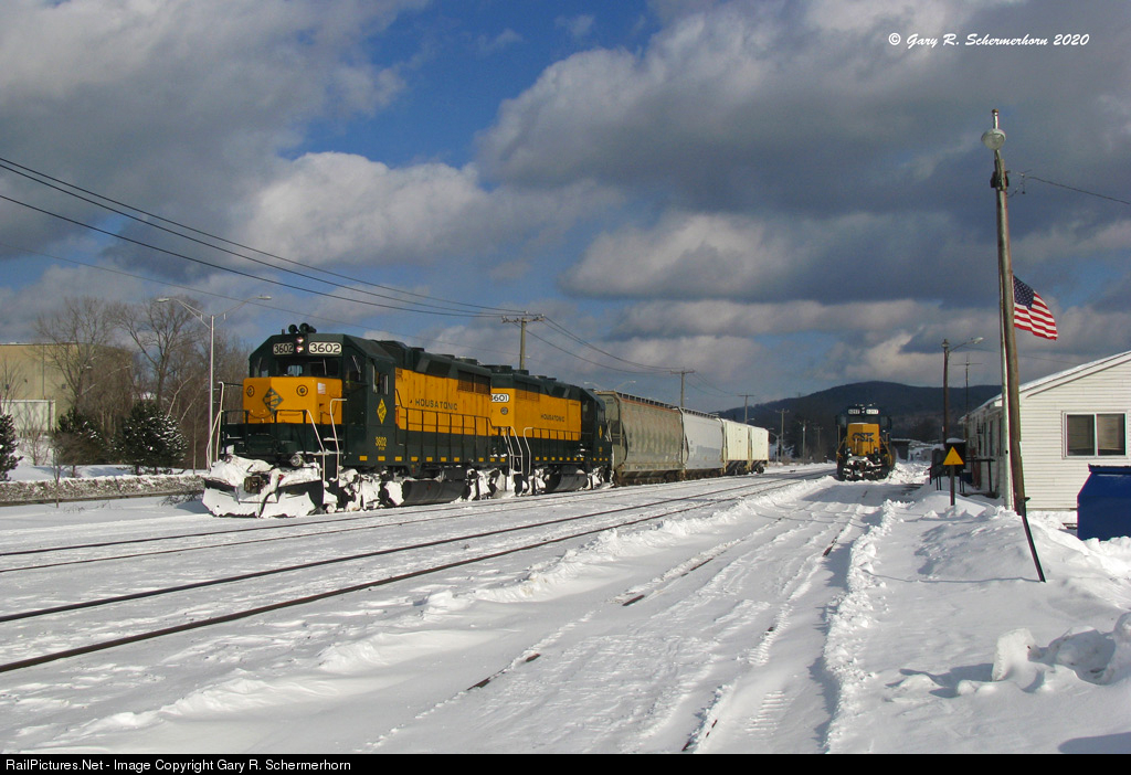 | On a windy frigid day in the Berkshires, Housatonic local NX-12 prepares to depart West on the main with its CSXT interchange pickup beside the Pittsfield Yard Office. |