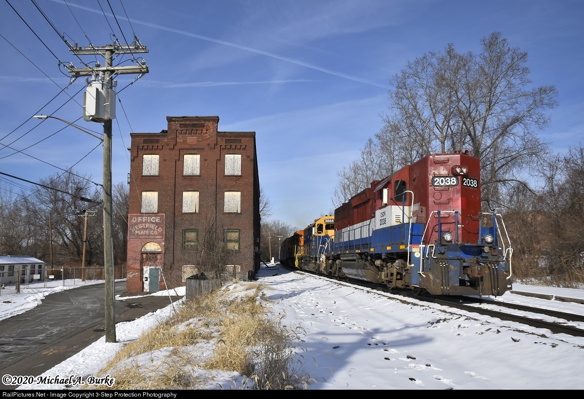 | Connecticut Southern CSO-4, led by high hood GP38 2038, passes the abandoned Westfield Plate Company in Thompsonville. 2038 was built in November of 1969 for the Southern Railway as their 2776.