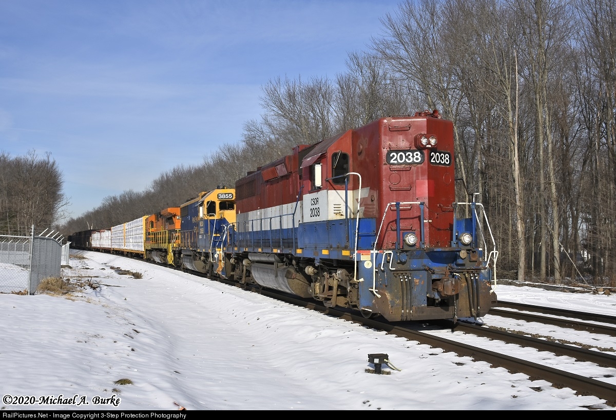 High hood GP38 2038 leads southbound Connecticut Southern CSO-4 in Windsor on a cold afternoon in January.