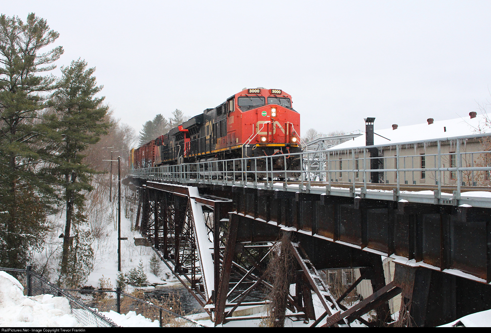 | A pair of GEs guide 451's train (Toronto-North Bay) north through the town of Bracebridge as icicles cling to the Muskoka River trestle. This steel structure dates back to 1906, built for the Grand Trunk Railway to replace the wooden one there previously. |