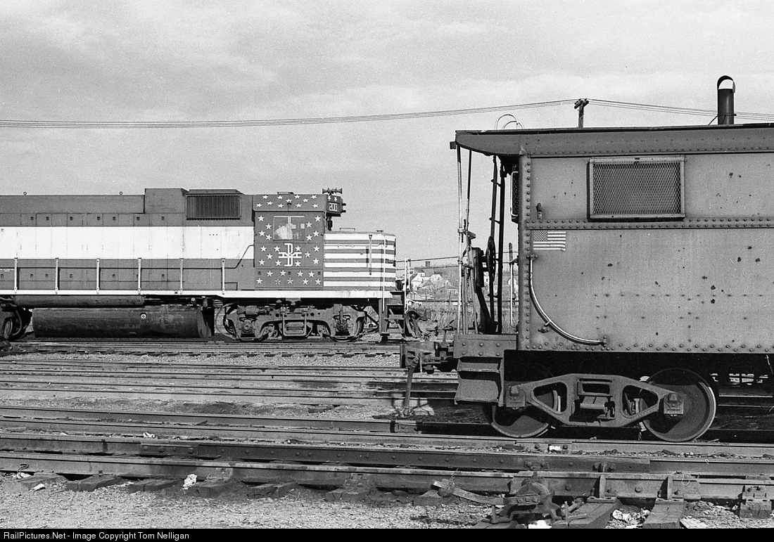 | A year after the nation's Bicentennial celebration, Boston & Maine GP38-2 200 still wears its star-spangled commemorative colors as it meets a flag-decaled caboose (always a "buggy" on the B&M) in the Boston freight yard at East Somerville, MA. |