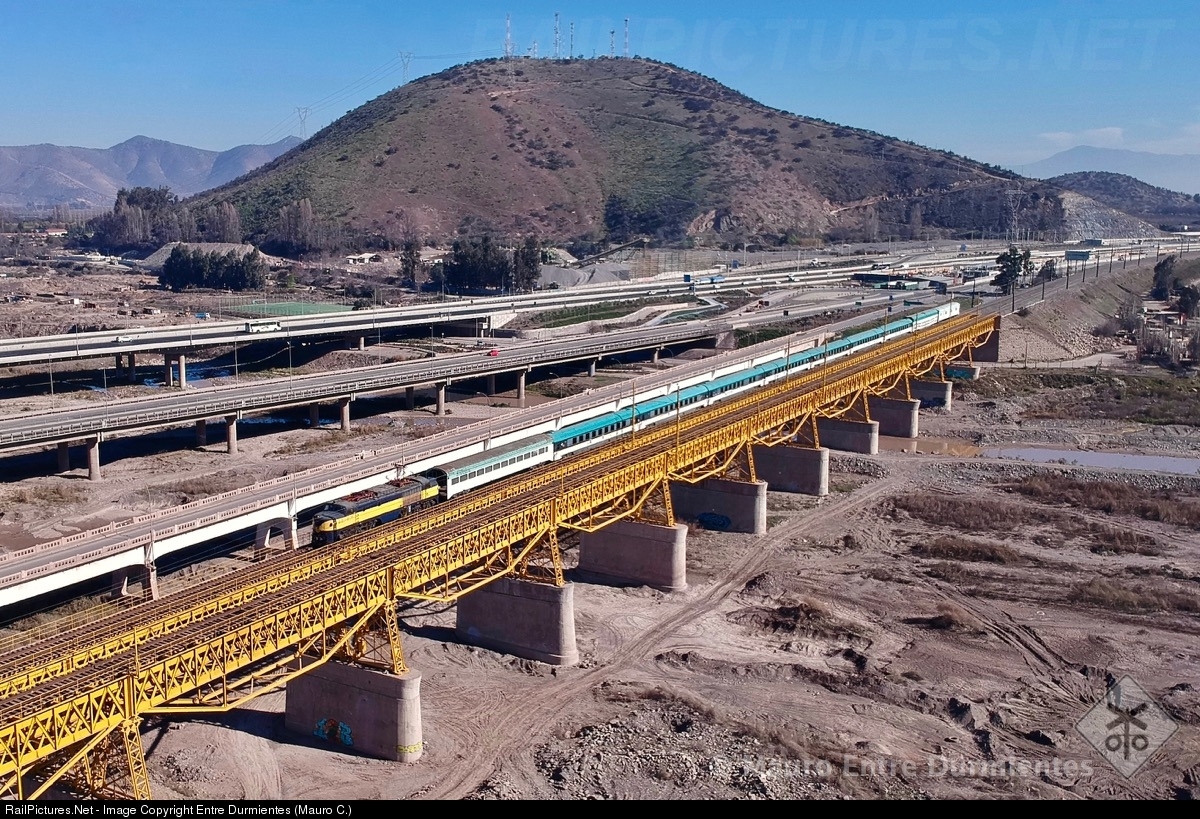 | Special tourist service between Santiago - San Fernando, crosses the Maipo railroad bridge at the south exit of Gran Santiago and metropolitan area. E-32 electric locomotive of italian origin manufactured especially for the railroads of Chile by the italian consortium Gruppo Aziende Italiane (Breda, Marelli, Ansaldo and others) in Milan - Italy. |