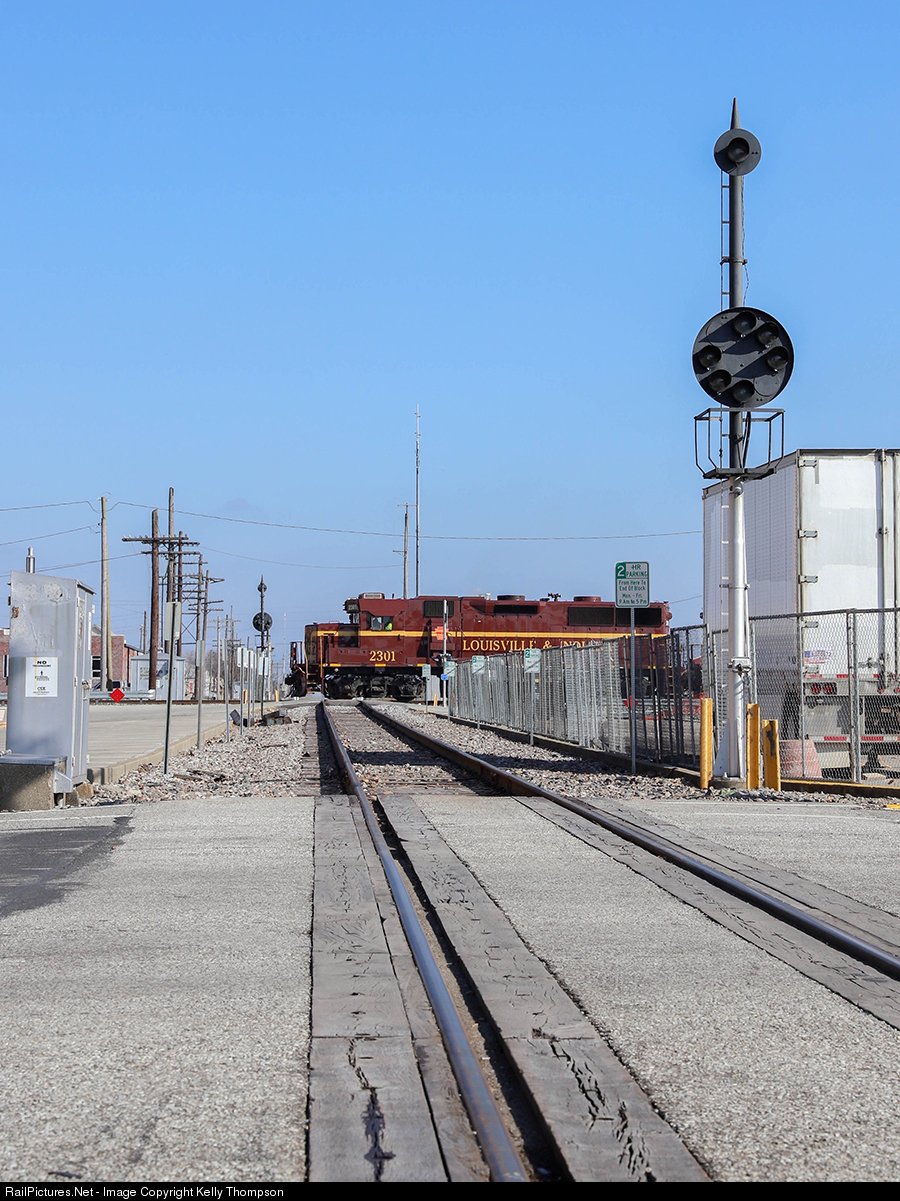 | LIRC 2301 breaks the midday silence in downtown Seymour, Indiana as it splits the town in half. To the right is an old B&O CPL signal that guards the diamond. |