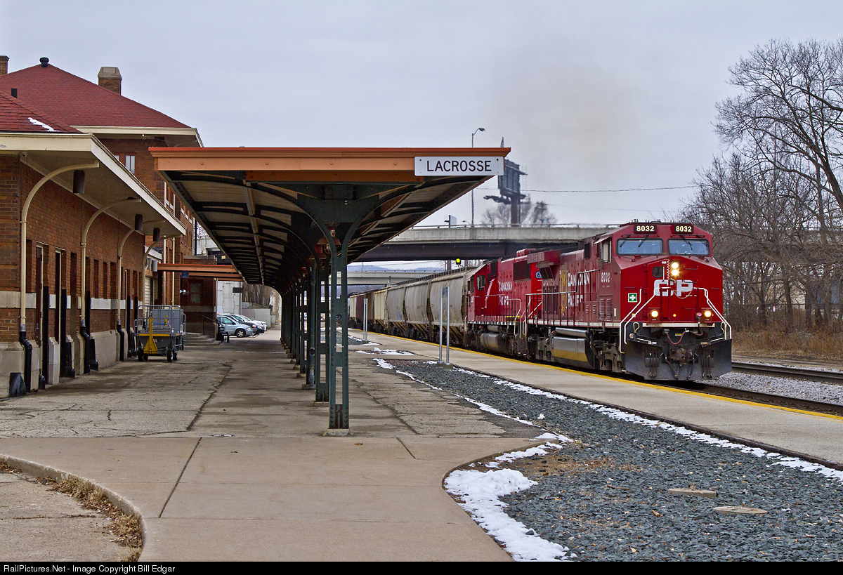 | CP 8032 and an SD60 roll a covered hopper train past the Amtrak depot at North La Crosse, WI. Very little snow for Christmas and New Years in the southern portion of the state of Wisconsin this season. This station was Milwaukee Road's and housed some of their offices as well. |