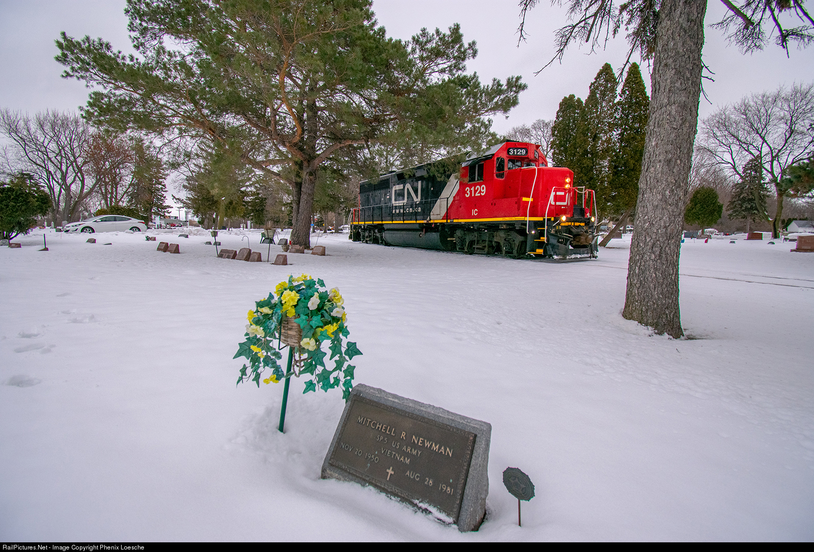| IC 3129 is seen cutting through St Mary's Cemetery on CN's Banta Spur in Menasha, WI. They are on their way back to the main (Manitowoc Subdivision) after spotting a car as LSC Communications. |