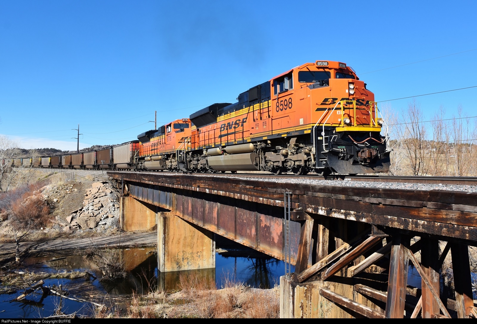 | BNSF 8598 (SD70ACe) leads a loaded coal train over a bridge at East Plumb Creek, south of Sedalia, Colorado. |