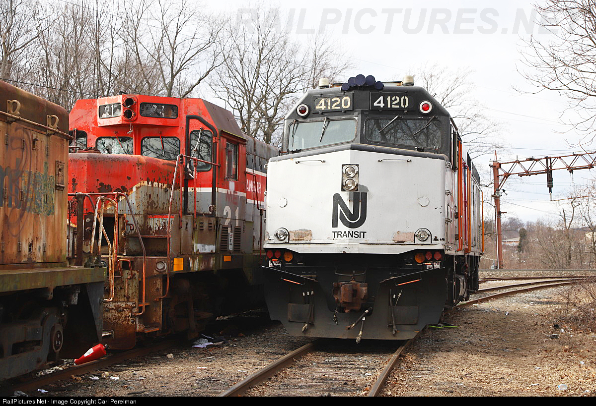 | The last NJ Transit locomotive to have positive train control installed at the M&E Morristown, N.J. shop was the 4120. This work was performed by Alstom and Parsons. Metro North F40PH-3C is still at the shop for PTC installation, and is expected to be released by the end of the week. The 4120 is parked next to a stored ex Bangor & Aroostook GP7u at the NJ Transit interchange. |
