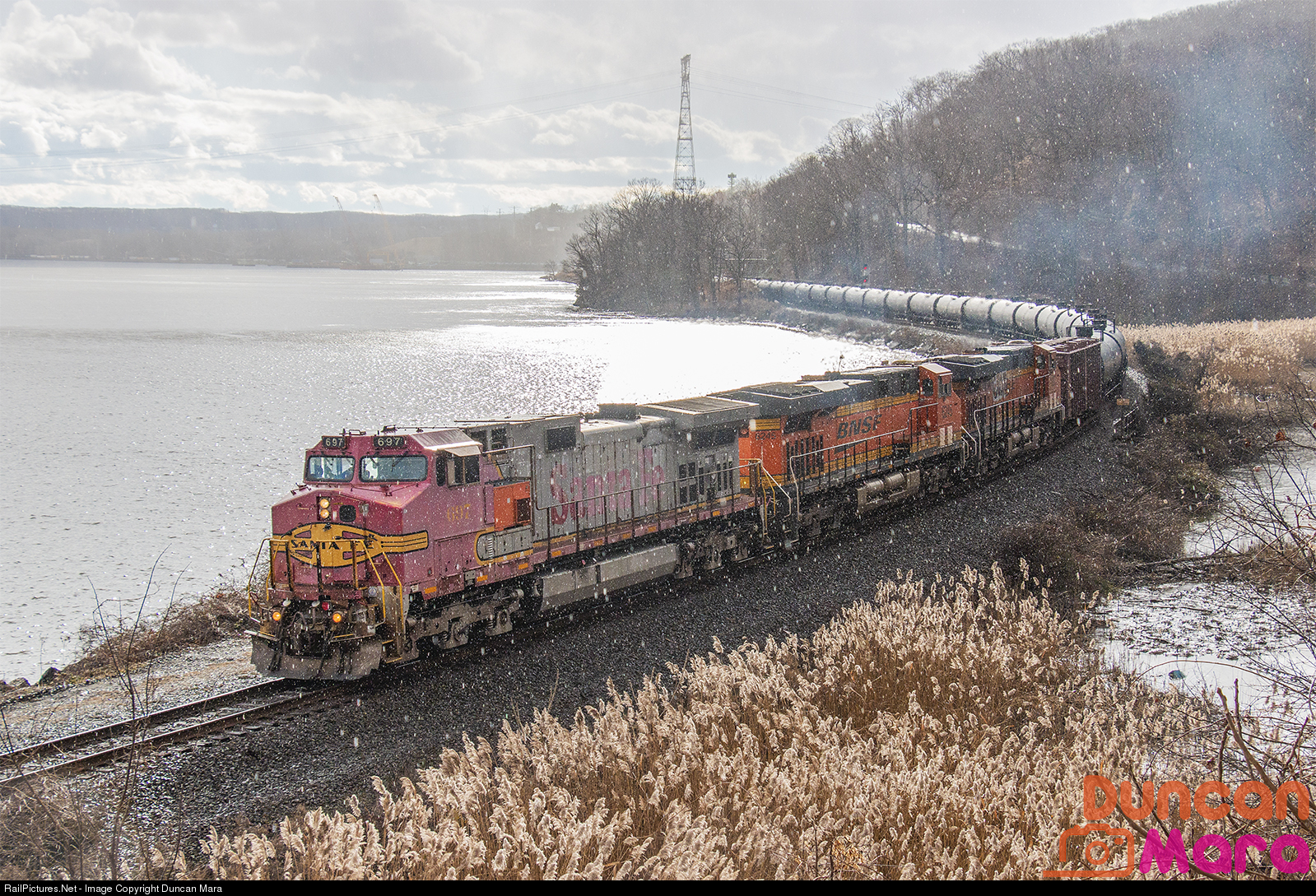 | CSX K13905 pulls out of CP-38 along the Hudson on the former West Shore with a former Santa Fe 'warbonnet' painted D9-44CW leading two BNSF GEs. An odd mix of hail and a break of sun through the clouds made for an odd, yet interesting scene as they accelerated out of the siding, |