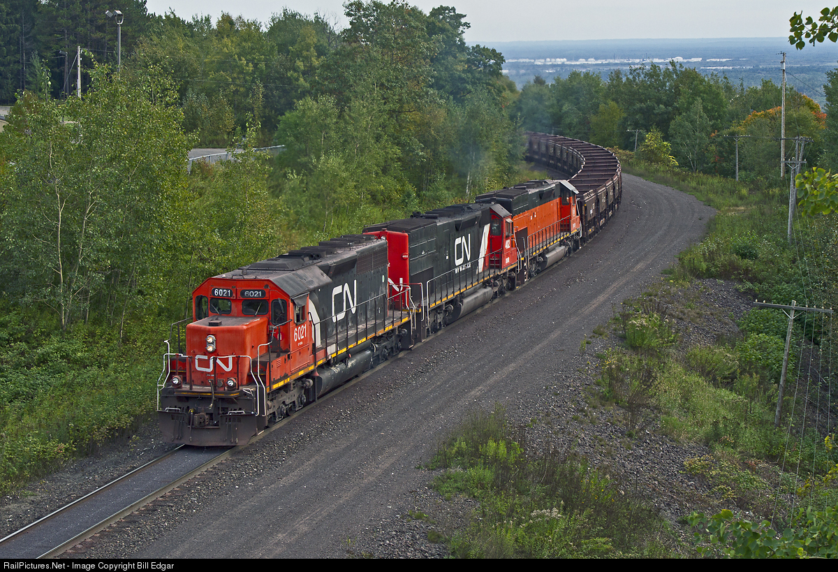 | CN 6021 leads an empty ore train up Proctor Hill at Boundary Rd. Oil refineries and storage tanks can be seen in the distance in Superior, WI. The dock transfer job is several minutes away from returning to Proctor Yard where cars will be switched into an ore train to head north to the iron range. |