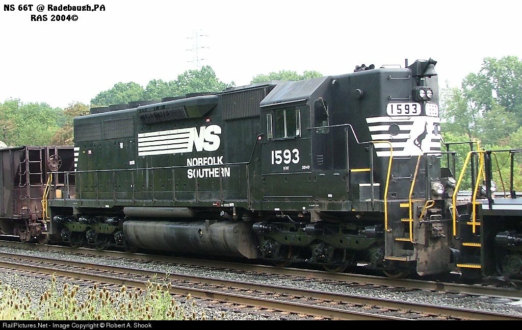 NS #1593 one of a very small amount of Hi-Hood SD40's is seen in revenue service on 66T. Note the freshly painted trucks on the SD40.