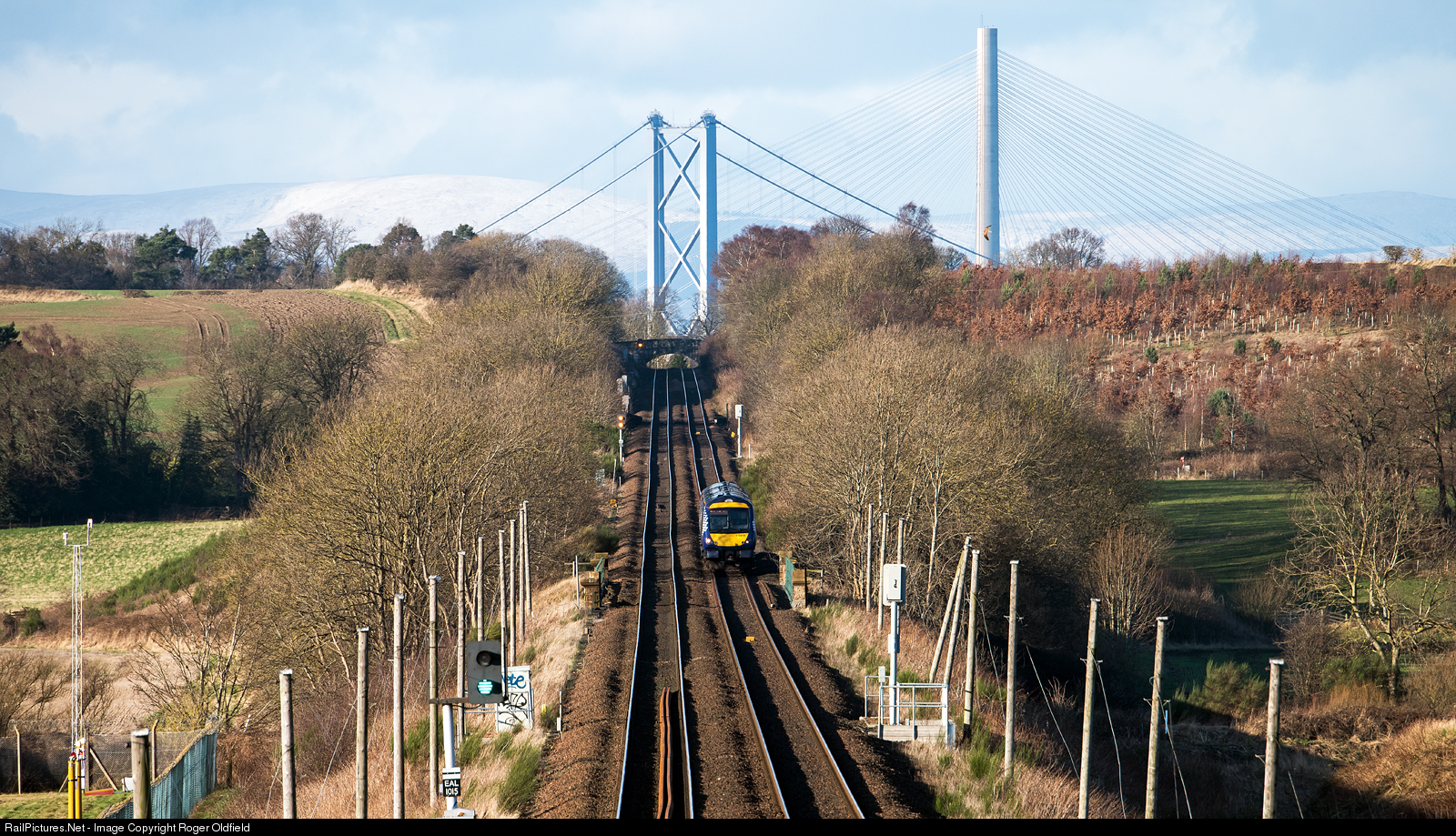 | Seen passing the runway approach lights for Edinburgh Airport, with the Forth Road Bridge and new Queensferry Crossing road bridge in the distance. |