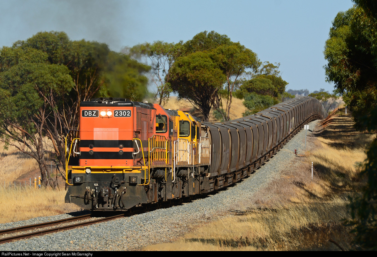 | An unusual locomotive arrangement sees DBZ2302, DBZ2305 & DBZ2301 work 2K04 loaded grain from Brookton through the former Hamersley siding at Wilberforce, bound for Kwinana Grain Terminal. |