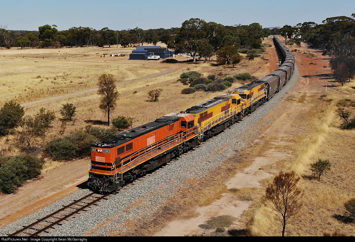 | An unusual locomotive arrangement sees DBZ2302, DBZ2305 & DBZ2301 work 2K04 loaded grain from Brookton through Mount Kokeby, bound for Kwinana Grain Terminal. |