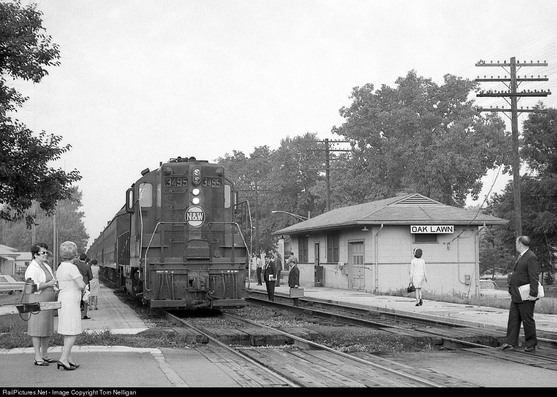 The ancestor of today's Metra Southwest Service was a single weekday commuter train between Orland Park, IL, and Chicago's Dearborn Station, inherited by the Norfolk & Western from the Wabash. Passengers prepared to board the inbound train as it pulled into the station at Oak Lawn behind an ex-Wabash GP9.