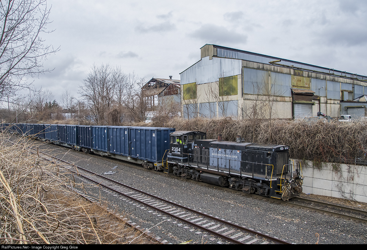 The New York Container Terminal Express Rail crew pulls a cut of trash cars past the Davidson Street Industrial Complex at Arlington Yard in Staten Island, New York. The crew is utilizing Morristown & Erie Railway's EMD MP15DC #2354, which is on loan while the company's "Genset" locomotive; CLCX #2058 receives some needed prime mover repairs at the M&E's shop. CLCX #2058 is a PL1500-4RS built by Process Locomtives from a former Peoria & Eastern GP20 and features a Tier 3, 1560HP CAT Engine. This locomotive was purchased by NYCT Express Rail years ago to replace a leased GMTX GP38-2. |