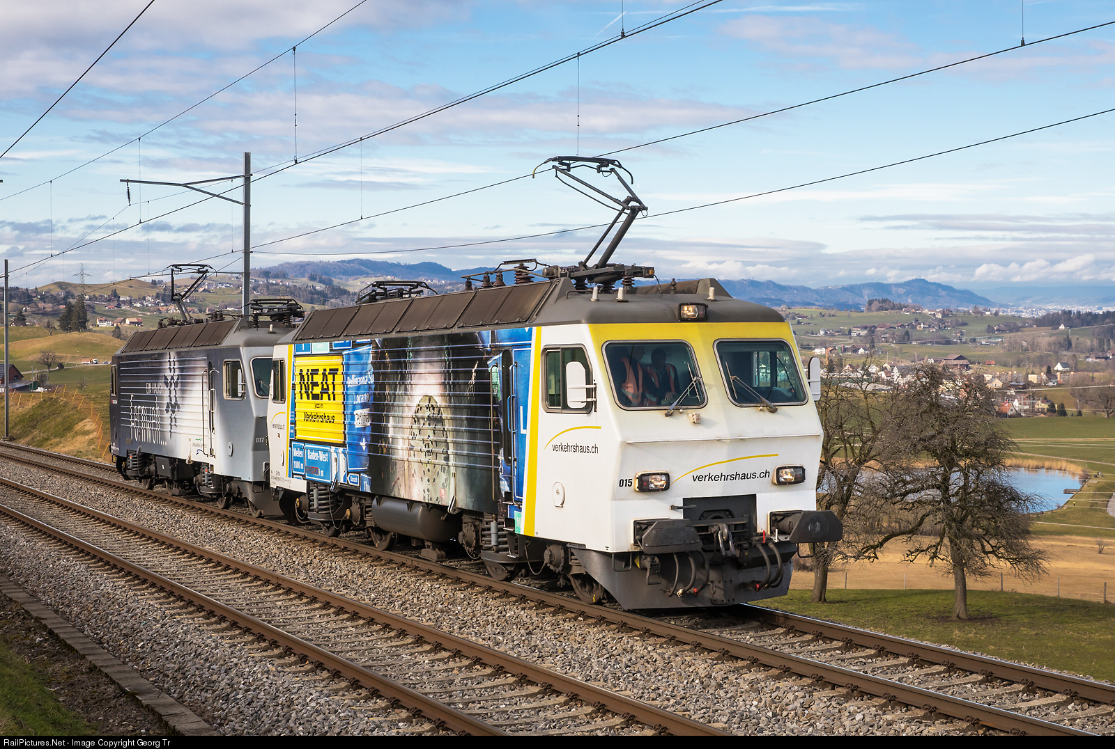 On this day, the former Südostbahn locomotives Re 446 # 015 (in publicity paint scheme for the NEAT exhibition in the Swiss Museum of Transport Lucerne) and # 017 (in publicity paint scheme Voralpen Express "Ein Hauch Fernweh..") were handed over to the new owner, the Eisenbahndienstleister Gmbh (EDG). The locomotives are on a approval run from Samstagern to Biberbrugg and back, on the 5.0 % grade between Samstagern and Schindellegi-Feusisberg. This 4960 kW locomotives were built in 1982 by SLM and BBC for the SBB as Re 4/4 IV # 10101 and # 10103, and came to the Südostbahn in 1994/1996. The four Re 446 are not needed any more by the Südostbahn since the change of the Voralpen-Express from push-pull trains to the new TRAVERSO trains from StadlerRail.