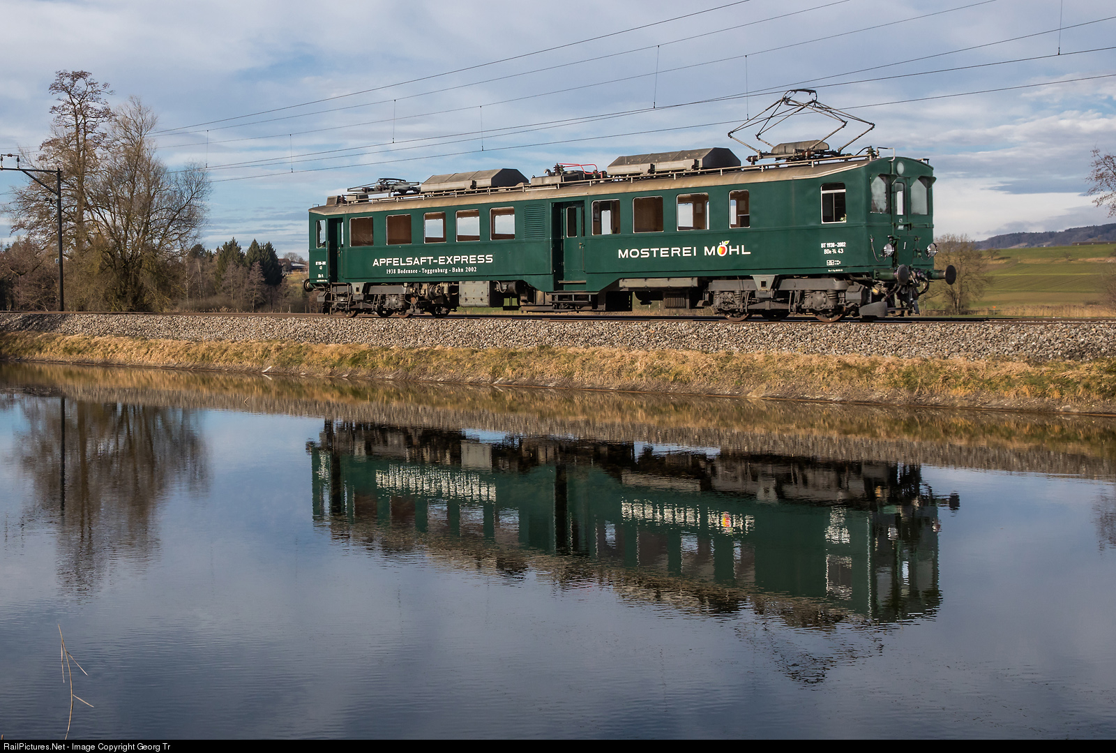 | Railcar BDe 3/4 # 43 "Apfelsaft-Express Mosterei Möhl" of the Eurovapor is running along the pond at Riedt near Erlen on a brithday party trip. This vehicle was built in 1938 for the Bodensee-Toggenburg-Bahn (BT) and came to the Eurovapor in 2011. The railcar got an inscription "1938 Bodensee-Togggenburg-Bahn 2002" shortly and small "BT" symbols on the front. |