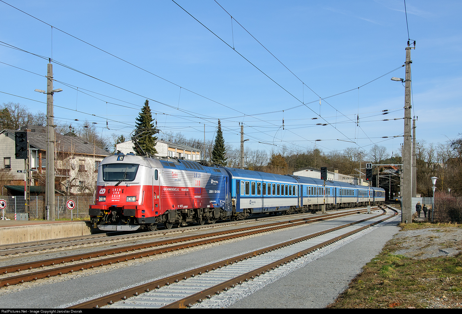 | CZ / 196 Praha - Ceske Budejovice - Linz (Ex 333 JIZNI EXPRES). Advertising on the locomotive commemorates 100 years of the Czech Republic (1918 - 2018) |