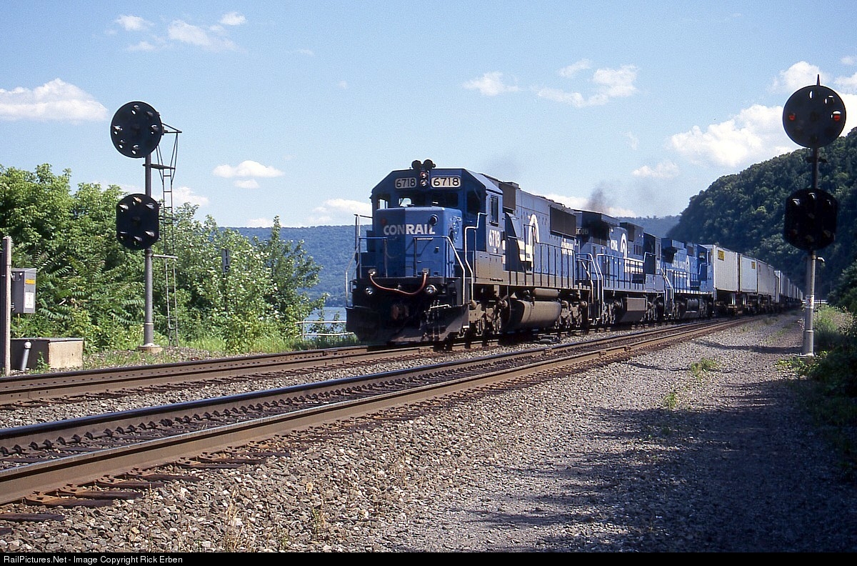 One of the daily fleet of trailvans negotiates the crossover at View interlocking before hitting its stride along the old Middle Division. The Susquehanna River in the background curves through the valley just below its confluence with the Juniata River, thus the descriptive name for the former interlocking station here - now just a control point on a dispatchers' screen. Fuji Sensia.