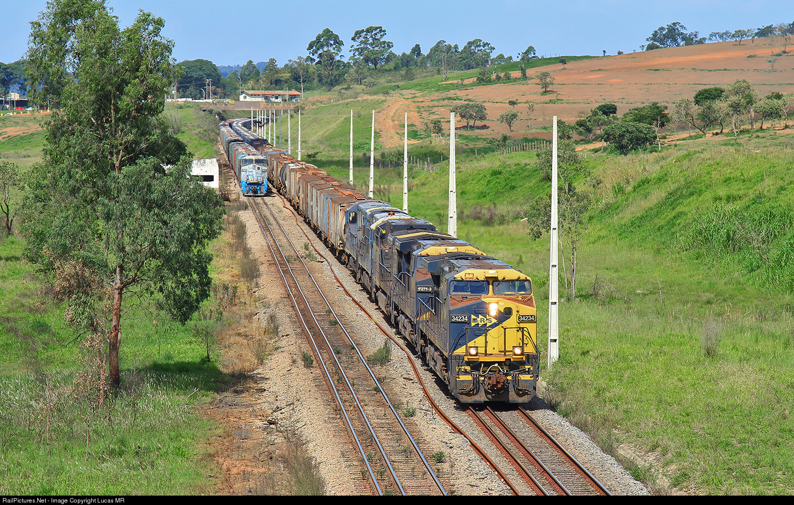 Northbound MRS train M87 led by AC44i #3423 meet southbound Rumo train X68 at GuaianĂ£ yard.